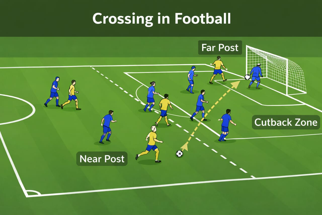 Crossing in football refers to delivering the ball from wide areas into the penalty box with the aim of creating a scoring opportunity. These deliveries can vary in height, speed, and direction depending on the situation, defensive shape, and attacking movement.